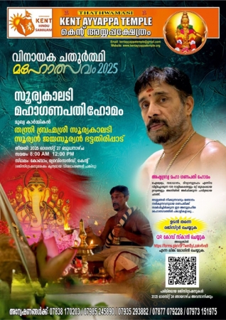 ഇംഗ്ലണ്ടിലെ കെന്റ് അയ്യപ്പ ക്ഷേത്രം വിനായക ചതുര്ഥി മഹോത്സവം 27ന് നടക്കും. കെന്റില് ആദ്യമായി നടക്കുന്ന അഷ്ടദ്രവ്യ മഹാ ഗണപതി ഹോമത്തില് പങ്കുചേരുവാന് ഏവരെയും ഭാരവാഹികള് ക്ഷണിച്ചു.