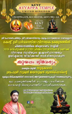 ഇംഗ്ലണ്ടിലെ കെന്റ് ശ്രീ ധര്മശാസ്ത വിനായക ക്ഷേത്രത്തില് 2025 സെപ്റ്റംബര് 5 ചിങ്ങമാസത്തിലെ തിരുവോണ നാളില് രാവിലെ 8 മണിക്ക് വിനായക സ്വാമിയുടെ ഇഷ്ടവഴിപാടായതും ഉദ്ധിഷ്ടകാര്യ സിദ്ധിക്കായി സമര്പ്പിതവുമാകുന്ന ഒറ്റയപ്പം നിവേദ്യം ക്ഷേത്രം തന്ത്രി സൂര്യകാലടി ബ്രഹ്മശ്രീ സൂര്യന് ജയസൂര്യന് ഭട്ടത്തിരിപ്പാടിന്റെ മുഖ്യകര്മികത്വത്തില് നടത്തപ്പെടുന്നു.