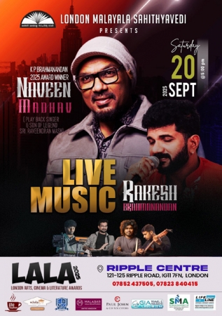 ലണ്ടന് മലയാള സാഹിത്യവേദിയുടെ ആഭിമുഖ്യത്തില് പ്രമുഖ ഗായകന് കെ പി ബ്രഹ്മാനന്ദന്റെ മകനും ഗായകനുമായ രാകേഷ് ബ്രഹ്മാനന്ദന് നയിക്കുന്ന ലൈവ് മ്യൂസിക് പ്രോഗ്രാം LALA 2025 സെപ്റ്റംബര് 20 ശനിയാഴ്ച്ച ബാര്ക്കിങില് റിപ്പിള് സെന്റററില് നടത്തപ്പെടുന്നു. വൈകുന്നേരം 5 മണിക്ക് ആരംഭിക്കുന്ന പരിപാടിയില് യുകെയിലെ കലാസാംസ്കാരിക രംഗത്തെ പ്രമുഖര് പങ്കെടുക്കുന്നു.