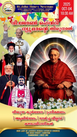 മലങ്കര സുറിയാനി കത്തോലിക്കാ സഭയുടെ യുകെയിലെ കേംബ്രിഡ്ജ് മിഷന്റെ ഇടവക മധ്യസ്ഥനായ വിശുദ്ധ ജോണ്‍ ഹെന്റി ന്യൂമാന്റെ തിരുനാള്‍ നാളെ (ശനിയാഴ്ച) ആഘോഷിക്കും. രാവിലെ 10:30ന് സ്വസ്ടണ്‍ ഔവര്‍ ലേഡി ഓഫ് ലൂര്‍ദ്ദ് റോമന്‍ കത്തോലിക്കാ പള്ളിയില്‍ (CB22 3HJ) വെച്ച് വികാരി ഫാ. കുര്യാക്കോസ് തിരുവാലില്‍ വി. കുര്‍ബ്ബാന അര്‍പ്പിക്കും. തുടര്‍ന്ന് പ്രദക്ഷിണം, ആശീര്‍വാദം നേര്‍ച്ച വിളമ്പ്, അഗപ്പെ, കലാപരിപാടികള്‍ ഉണ്ടാകും.