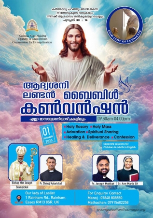 റയിന്‍ഹാം: ഗ്രേറ്റ് ബ്രിട്ടന്‍ സീറോമലബാര്‍ എപ്പാര്‍ക്കി ഇവാഞ്ചലൈസേഷന്‍ കമ്മീഷന്റെ നേതൃത്വത്തില്‍, ലണ്ടനില്‍ വെച്ച് മാസം തോറും സംഘടിപ്പിക്കുന്ന 'ആദ്യ ശനിയാഴ്ച്ച ബൈബിള്‍ കണ്‍വെന്‍ഷന്‍' നവംബര്‍ ഒന്നിന് ശനിയാഴ്ച ഉണ്ടായിരിക്കുന്നതാണ്. ലണ്ടനില്‍ റയിന്‍ഹാം ഔര്‍ ലേഡി ഓഫ് ലാസലേറ്റ് കത്തോലിക്കാ ദേവാലയത്തിലാണ് കണ്‍വെന്‍ഷന്‍ ക്രമീകരിച്ചിരിക്കുന്നത്.