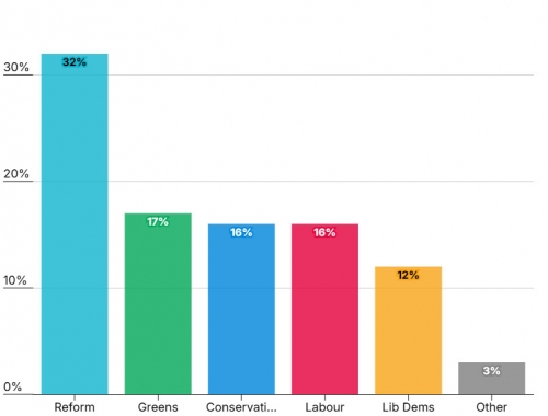 ലേബര് പാര്ട്ടിയും കണ്സര്വേറ്റീവ് പാര്ട്ടിയും പിന്തള്ളപ്പെടുന്ന സ്ഥിതിയാണ്. റിഫോം യുകെ 32 ശതമാനം വോട്ടുകളുമായി മുന്നേറ്റം തുടരുകയാണ്. ഗ്രീന്സ് ഒക്ടോബര് ആദ്യം മുതല് തന്നെ പോയിന്റ് നിലയില് അഞ്ചു ശതമാനത്തിന്റെ വര്ധനവ് നേടി എന്നാണ് കണക്കുകള് പറയുന്നത്.