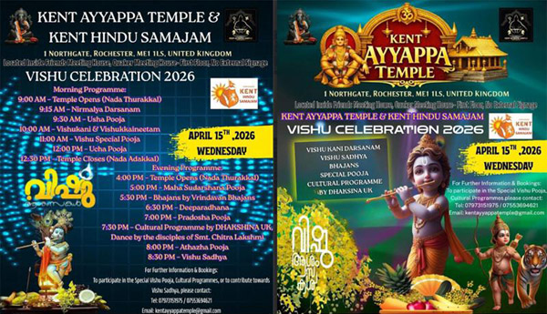 വിഷു ആഘോഷങ്ങള്ക്ക് ഒരുങ്ങി ഇംഗ്ലണ്ടിലെ കെന്റ് അയ്യപ്പ ക്ഷേത്രവും കെന്റ് ഹിന്ദു സമാജവും. ഈമാസം 15ന് വിഷു ദിവസം രാവിലെ ഒന്പതു മണിക്ക് നട തുറക്കും, 9:15ന് നിര്മ്മാല്യ ദര്ശനം, 9:30ന് ഉഷപൂജ, 10 മണിക്ക് വിഷു കണിയും, വിഷു കൈനീട്ടവും, 11 മണിക്ക് വിഷു പ്രത്യേക പൂജ, ഉച്ചക്ക് 12 മണിക്ക് ഉച്ചപൂജ, 12:30ന് നട അടക്കല്. വൈകുന്നേരം നാലു മണിക്ക് നട തുറക്കല്, അഞ്ചു മണിക്ക് മഹാസുദര്ശന പൂജ, 5:30ന് വൃന്ദാവന് ഭജന്സ് അവതരിപ്പിക്കുന്ന ഭജന, 6:30ന് ദീപാരാധന, ഏഴു മണിക്ക് പ്രദോഷപൂജ, 7:30ന് ചിത്ര ലക്ഷ്മി നേതൃത്വം കൊടുക്കുന്ന ദക്ഷിണ യുകെ അവതരിപ്പിക്കുന്ന കള്ച്ചറല് പ്രോഗ്രാംസ്, എട്ടു മണിക്ക് അത്താഴ പൂജ, പൂജകള്ക്ക് അഭിജിത്ത്, താഴൂര് മന ഹരിനാരായണന് നമ്പിടിശ്വര് എന്നിവര് കാര്മികത്വം വഹിക്കും. വെള്ളിയോട്ടില്ലാം അദ്രിത് വാസുദേവ് പൂജകള്ക്ക് സഹ കര്മികത്വം വഹിക്കും 8:30 ന് വിഷുസദ്യ വിഷു സദ്യക്ക് രജിസ്റ്റര് ചെയ്യേണ്ടതാണ്.
