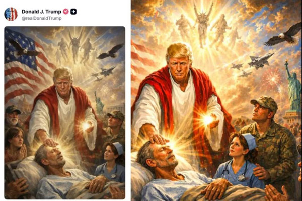 സ്വയം യേശുക്രിസ്തുവായി അനുകരിക്കുന്ന ചിത്രം പങ്കുവെച്ചത് അതില് താനൊരു ഡോക്ടറായി തോന്നിയത് കൊണ്ടാണെന്ന് നായീകരിച്ച് ഡൊണാള്ഡ് ട്രംപ്. പോപ്പുമായി തര്ക്കത്തില് ഏര്പ്പെട്ടതിനൊപ്പം പങ്കുവെച്ച ചിത്രമാണെങ്കിലും ഇത് മാപ്പ് പറയില്ലെന്നും യുഎസ് പ്രസിഡന്റ് വ്യക്തമാക്കി.