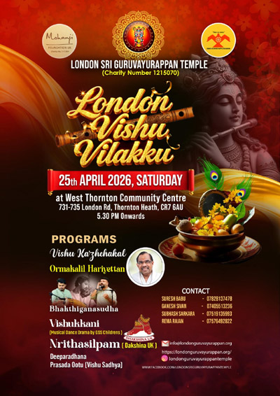 ലണ്ടന് ശ്രീ ഗുരുവായൂരപ്പ സേവാസംഘവും,മോഹന്ജി ഫൗണ്ടേഷനും ചേര്ന്ന് ലണ്ടന് വിഷു വിളക്ക് സംഘടിപ്പിക്കുന്നു. ഏപ്രില് 25 ശനിയാഴ്ച വൈകുന്നേരം 5.30 PM മുതല് ലണ്ടനിലെ ക്രോയ്ഡണ് തോണ്ടണ് ഹീത്തിലെ വെസ്റ്റ് തൊണ്ടോന് കമ്മ്യൂണിറ്റി സെന്ഡറില് വച്ചാണ് ചടങ്ങുകള് നടത്തപ്പെടുന്നത്.അന്നേ ദിവസം ലൈവ് ഓര്ക്കസ്ട്രയോട് കൂടിയ ഭക്തി ഗാനസുധ,വിഷുക്കണി,ശ്രീമതി ചിത്ര ലക്ഷ്മി നേതൃത്വം കൊടുക്കുന്ന ദക്ഷിണ യുകെ അവതരിപ്പിക്കുന്ന നൃത്തശില്പം ,അകാലത്തില് ലണ്ടന് മലയാളികളെ വിട്ടു പോയ ഹരിയേട്ടനെ അനുസ്മരിക്കുന്ന ചടങ്ങായ ഓര്മകളില് ഹരിയേട്ടന് , ശേഷം ദീപാരാധന,പ്രസാദഊട്ട് (വിഷുസദ്യ) എന്നിവ ഉണ്ടായിരിക്കുന്നതാണ് .സാമൂഹ്യ ,സാംസ്കാരിക രംഗത്തെ പ്രമുഖര് ഈ ചടങ്ങില് പങ്കെടുക്കും.ഈ സായം സന്ധ്യയിലേക്കു എല്ലാവരെയും സ്വാഗതം ചെയ്യുന്നതായി സംഘടകര് അറിയിച്ചു