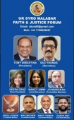 യുണൈറ്റഡ് കിങ്ഡം സീറോമലബാര് ഫെയിത് ആന്ഡ് ജസ്റ്റിസ് ഫോറം നേതാക്കളെ ഒക്ടോബര് മാസം 11 നു കൂടിയ പൊതുയോഗത്തില് വച്ച് തിരഞ്ഞെടുത്തു. 2016 ല് യു കെ യില് സ്ഥാപിതമായ ഗ്രേറ്റ് ബ്രിട്ടണ് സീറോ മലബാര് സഭയുടെ രൂപതയുമായി ബന്ധപ്പെട്ടു ഉയര്ന്നുവരുന്ന കൂദാശ മുടക്കലും ,ഭീഷണിയും , കാനോന് നിയമത്തെ തെറ്ററായി വിവക്ഷിച്ചുകൊണ്ട് ലാറ്റിന് പള്ളിയില് നടത്തുന്ന കൂദാശകള് തടയുന്നതിന് വേണ്ടി ലെറ്റര് അയക്കുക എന്നി ക്രൈസ്തവവിരുദ്ധ പ്രവര്ത്തനത്തെ പ്രതിരോധിക്കുന്നതിനും വിശ്വാസികളെ ബോധവല്ക്കരിക്കുന്നതിനും വേണ്ടിയാണു ഫോറം രൂപീകരിച്ചിരിക്കുന്നതെന്നു ഭാരവാഹികള് അറിയിച്ചു.