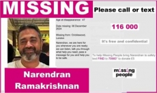 2024 സെപ്റ്റംബര് വരെ ലണ്ടനിലെ ജെപി മോര്ഗനില് എക്സിക്യൂട്ടീവ് ഡയറക്ടറായി ജോലി ചെയ്തിരുന്ന രാമകൃഷ്ണനെ പുതിയ ജോലി അന്വേഷിക്കുന്നതിനിടെയാണ് കാണാതായത്. അദ്ദേഹത്തിന് ചില കുടുംബപരമായ പ്രശ്നങ്ങള് ഉണ്ടായിരുന്നതായുള്ള റിപ്പോര്ട്ടുകളും പുറത്തു വന്നിട്ടുണ്ട്. യുഎഇയില് താമസിക്കുന്ന സഹോദരന് രാമകൃഷ്ണനെ കണ്ടെത്താനായി പൊതുജനങ്ങളോട് സഹായം അഭ്യര്ത്ഥിച്ചിട്ടുണ്ട്.