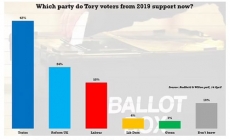 റെഡ്ഫീല്ഡ് & വില്ടണ് സര്വ്വെയില് 2019 തെരഞ്ഞെടുപ്പില് ടോറികള്ക്ക് പിന്തുണ നല്കിയ 24 ശതമാനം വോട്ടര്മാര് നിഗല് ഫരാഗിന്റെ പിന്തുണയുള്ള റിഫോം യുകെ പാര്ട്ടിക്ക് വോട്ട് ചെയ്യുമെന്നാണ് വ്യക്തമാകുന്നത്. ഇത് റെക്കോര്ഡ് വര്ദ്ധനവാണ്. തെരഞ്ഞെടുപ്പില് ടോറികളെ പിന്തുണയ്ക്കുമെന്ന് 2019-ല് പാര്ട്ടിക്ക് വോട്ട് ചെയ്ത അഞ്ചില് രണ്ട് പേര് മാത്രമാണ് വ്യക്തമാക്കിയത്.