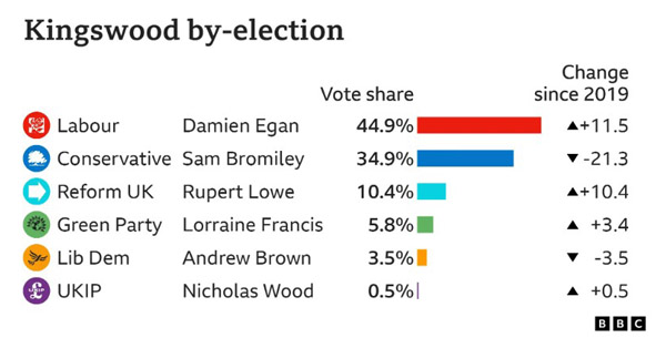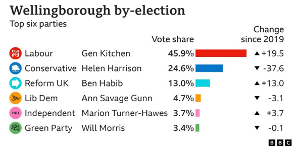 വെല്ലിംഗ്ബറോയില് കണ്സര്വേറ്റീവുകളുടെ 18,500-ലധികം ഭൂരിപക്ഷം മറികടന്ന് ലേബര് പാര്ട്ടി സീറ്റ് പിടിച്ചെടുത്തു. 28.5% മേധാവിത്തം നേടി യുദ്ധാനന്തര ഉപതിരഞ്ഞെടുപ്പില് ടോറികളില് നിന്ന് ലേബറിന്റെ രണ്ടാമത്തെ വലിയ മുന്നേറ്റമാണ്. ടോറികള്ക്ക് മുമ്പ് 11,000-ത്തിലധികം ഭൂരിപക്ഷമുണ്ടായിരുന്ന കിംഗ്സ്വുഡില്, 16.4% മുന്നേറ്റം ഉണ്ടായി.