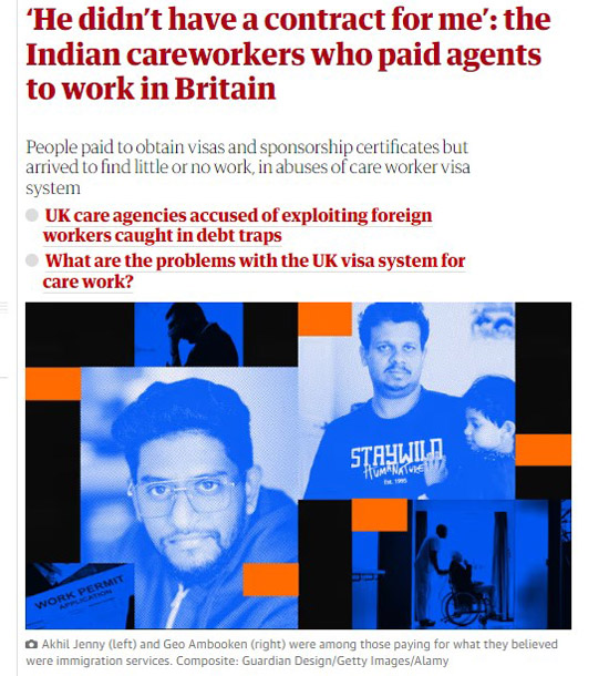 നാട്ടിലെ കടക്കെണിയില് നിന്നും രക്ഷപ്പെടാനുള്ള വഴി തേടി തിരുവനന്തപുരത്ത് നിന്ന് യുകെയിലേക്ക് എത്തിയ മലയാളി യുവാവ്. അഖില് ജെന്നിയുടെ ജീവിത ദുരിതം വാര്ത്തയാക്കിയിരിക്കുകയാണ് ഗാര്ഡിയന് പത്രം. നഴ്സിങ് യോഗ്യതയുള്ളയാള് കെയര് വര്ക്കര് ജോലിയിലായിരുന്നു എത്തിയത്. ഷിന്റോ സെബാസ്റ്റിയന് എന്ന ഇന്ത്യയിലെ ഏജന്റിന് പണം നല്കിയത് വീടു വിറ്റാണ്. യുകെയില് എത്തിയപ്പോഴാണ് സ്പോണ്സര് ചെയ്ത കമ്പനിയ്ക്ക് കെയര് ജോബ് നല്കാന് സാധിക്കില്ലെന്ന് മനസിലായത്. നിരവധി പേരാണ് ഏജന്റുകാരില് നിന്ന് പറ്റിക്കപ്പെടുന്നത്.