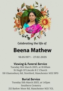 ബീനയുടെ നിര്യാണത്തില് ട്രാഫോര്ഡ് മലയാളി അസോസിയേഷനും സെന്റ് മേരീസ് ക്നാനാനായ മിഷനും ആദരാഞ്ജലികള് അര്പ്പിച്ചു.
