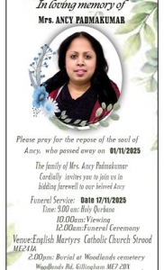 കാന്സര് ബാധിച്ചു മരണത്തിനു കീഴടങ്ങിയ കെന്റിലെ നഴ്സ് ആന്സി പദ്മകുമാറി (സോണിയ- 46) ന്റെ സംസ്കാരം 17ന് തിങ്കളാഴ്ച നടക്കും. രാവിലെ ഒന്പതു മണിയ്ക്ക് സ്ട്രൂഡ് ഇംഗ്ലീഷ് മാര്ട്ടിയാഴ്സ് ചര്ച്ചില് കുര്ബാനയോടു കൂടിയാണ് ചടങ്ങുകള് ആരംഭിക്കുക. പത്തു മണി മുതല് പൊതുദര്ശനവും പ്രാര്ത്ഥനാ ചടങ്ങുകളും ഉണ്ടാകും. തുടര്ന്ന് ഉച്ചയ്ക്ക് രണ്ടു മണിയ്ക്ക് ജില്ലിംഗ്ഹാമിലെ വൂഡ്ലാന്ഡ് സെമിത്തേരിയിലാണ് സംസ്കാരം. ആന്സിയെ അവസാന നോക്കുകാണാന് എത്തുന്ന പുരുഷന്മാര് കറുത്ത വസ്ത്രത്തിലും സ്ത്രീകള് വെളുത്ത വസ്ത്രത്തിലും എത്തണമെന്ന് കുടുംബം അഭ്യര്ത്ഥിച്ചു.